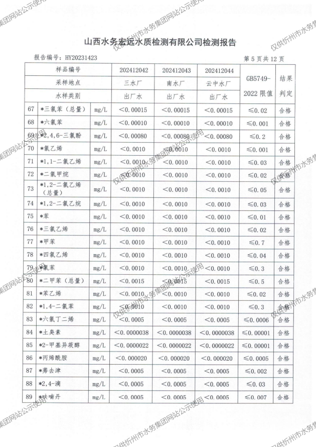 2024年忻州城區(qū)公共供水南水廠、三水廠、云中水廠出廠水97項水質(zhì)全分析