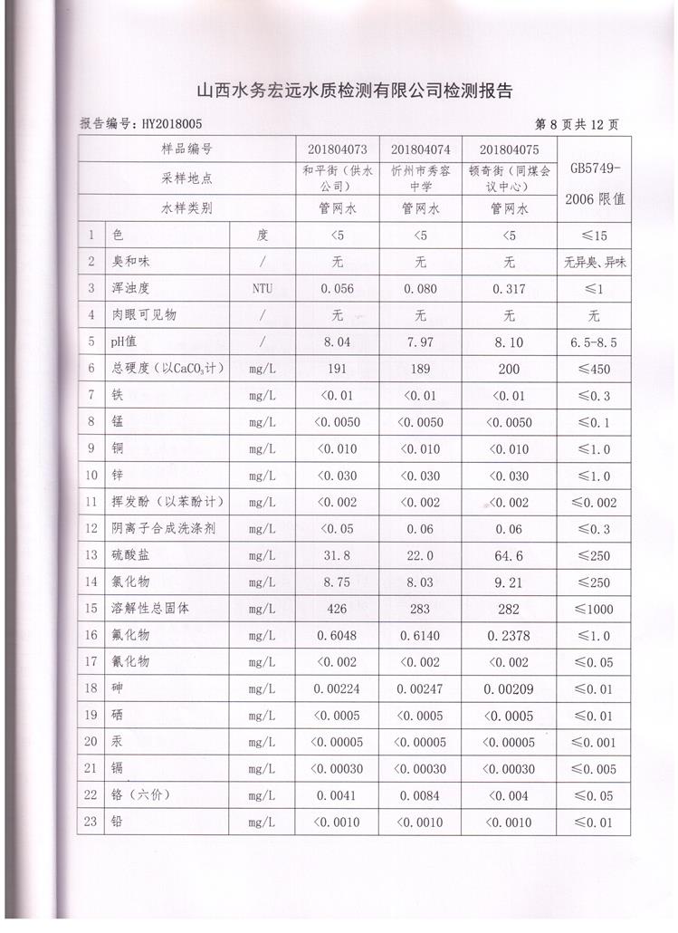 忻州城區(qū)公共供水水源水、出廠水、管網(wǎng)水、管網(wǎng)末梢水2018年4月份水質(zhì)信息公示