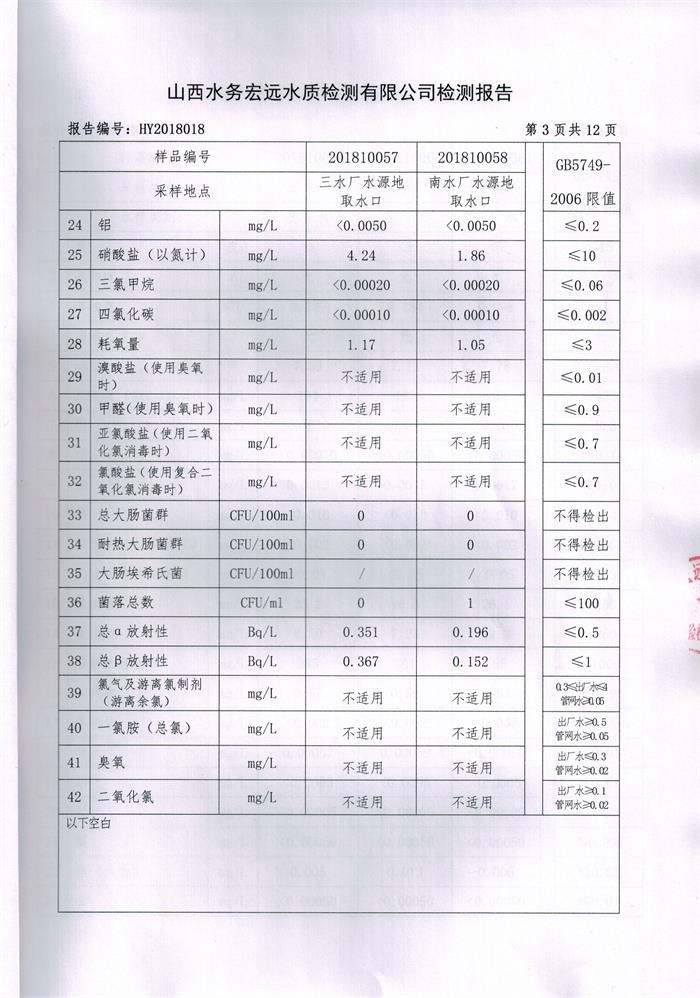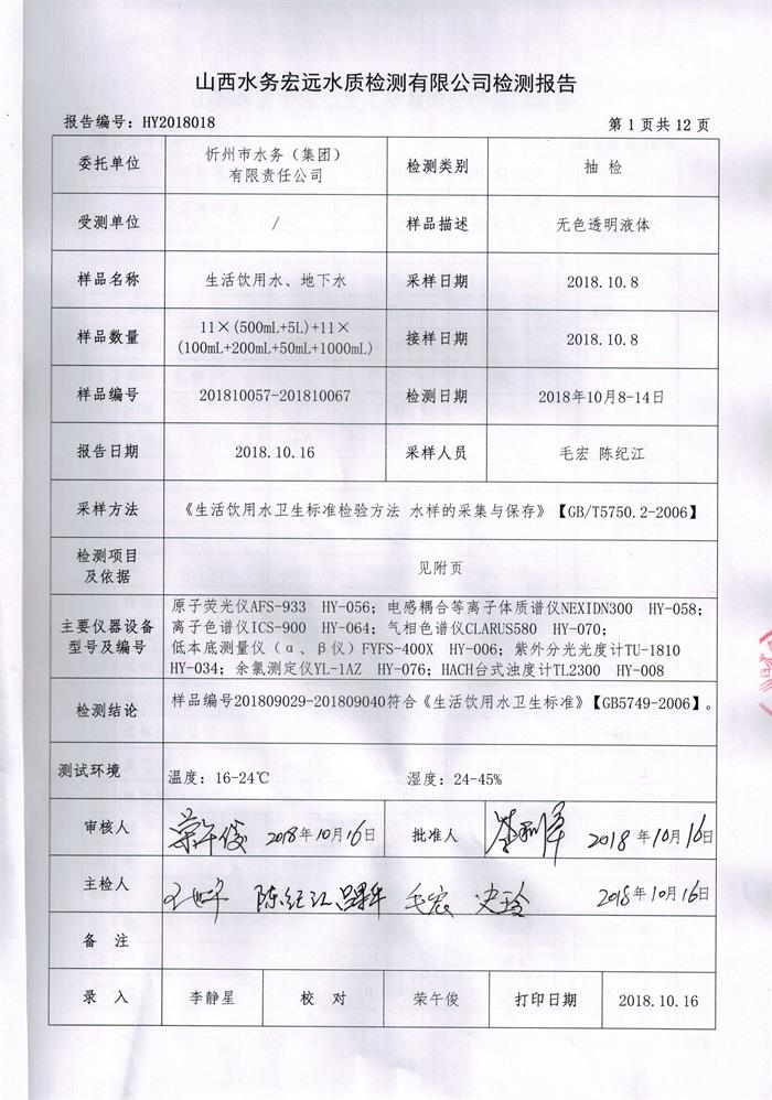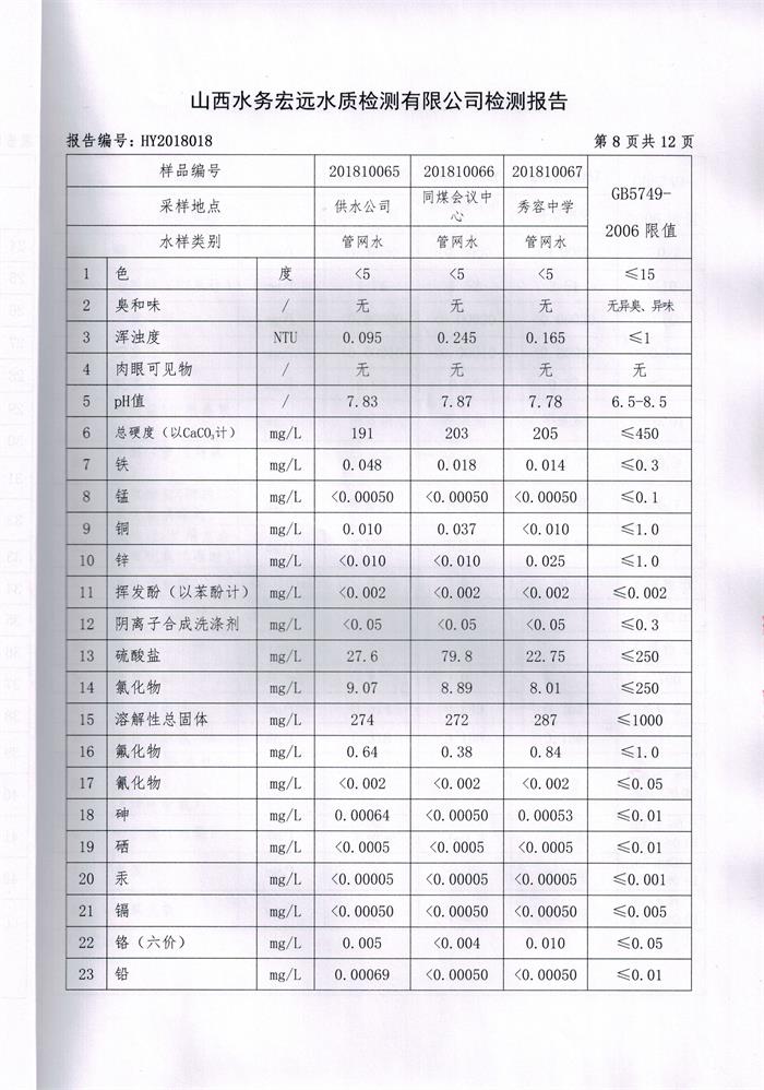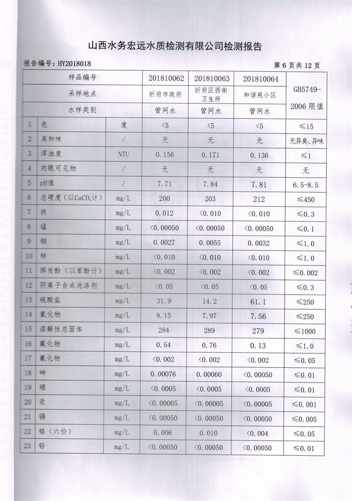 忻州城區(qū)公共供水水源水、出廠水、管網(wǎng)水、管網(wǎng)末梢水2018年10月份水質(zhì)信息公示
