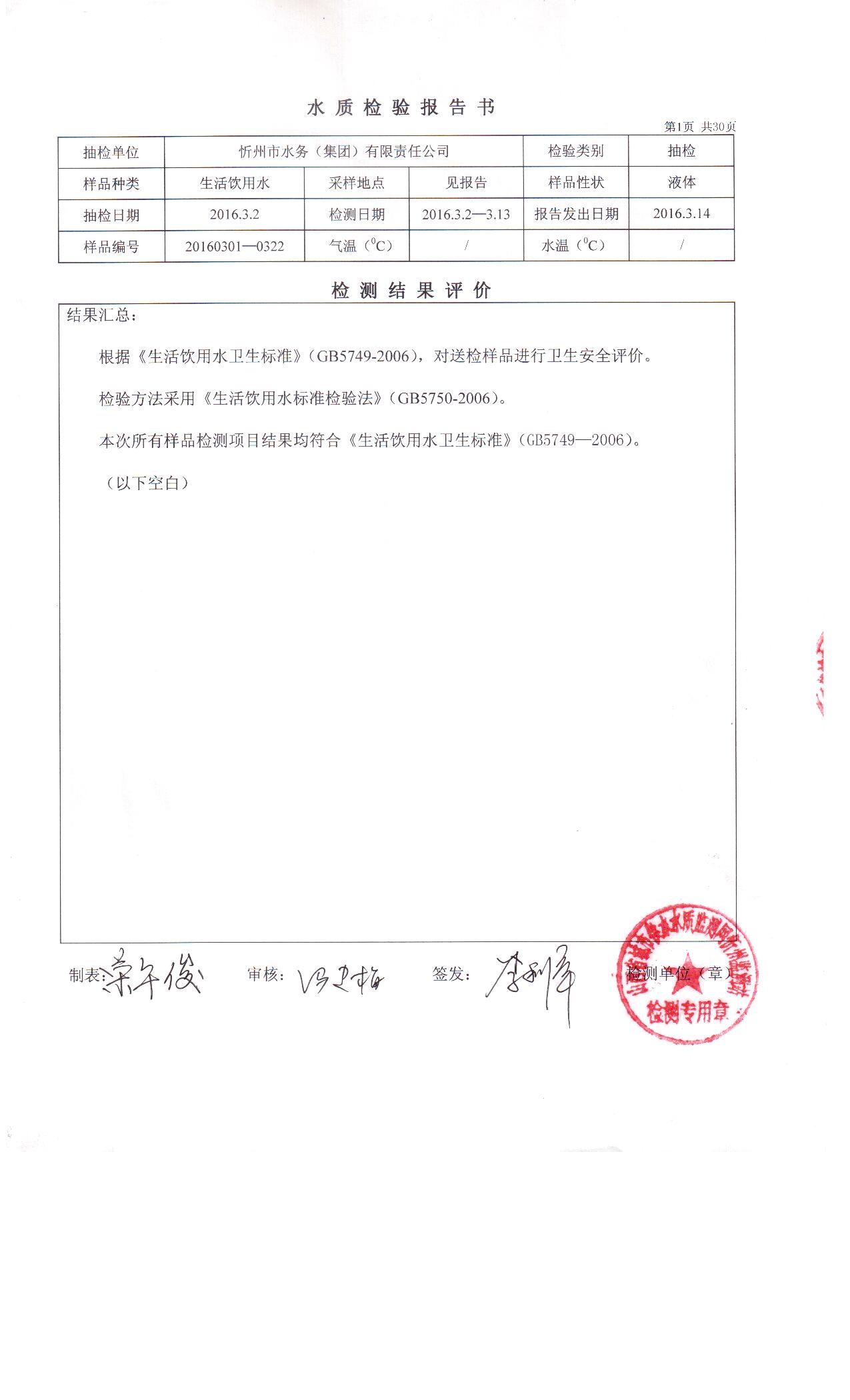 忻州城區(qū)公共供水2016年第一季度生活飲用水水質(zhì)信息